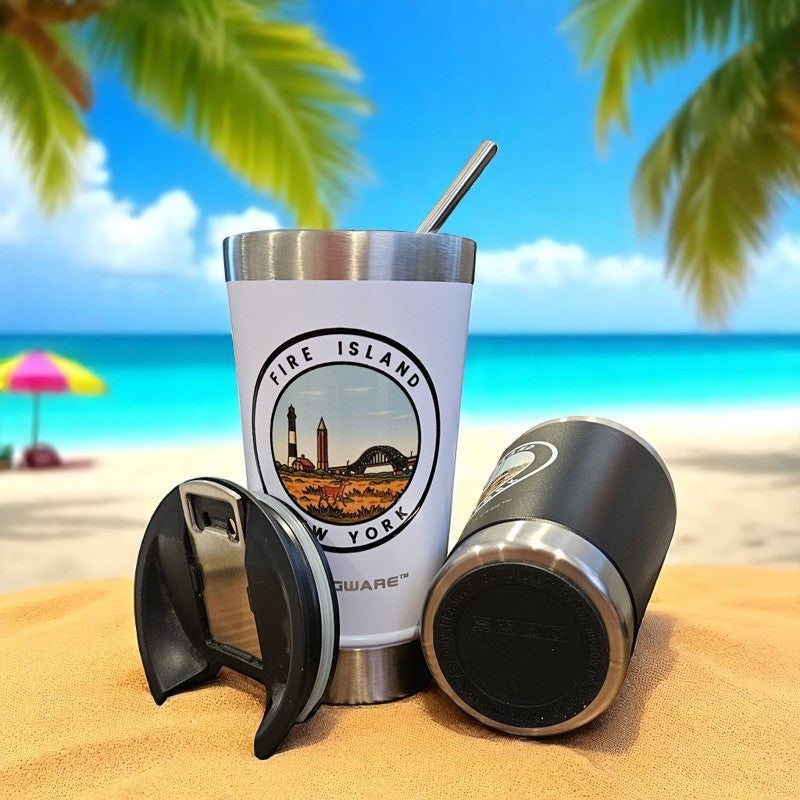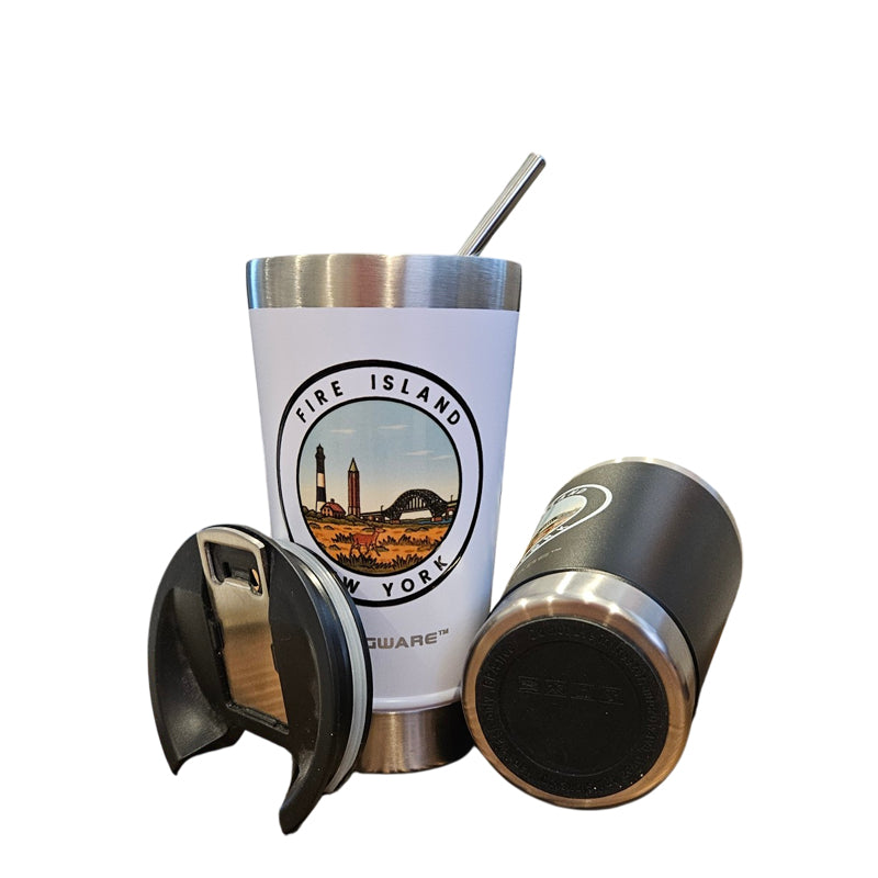 The Classy Pint Glass Features The Fire island Lighthouse, Robert Moses Bridge, Water Tower and you can take thisanywhere with you. Keep your favorite ale, IPA, lager and enjoy it cold througout. On the Boat at the Beach, Fishing where ever. Also great for soda, iced coffee or anything you want to keep cold. Comes with a secure fit lid and wide mouth and built in bottle opener so your ready for the next one. A metal straw is also included.